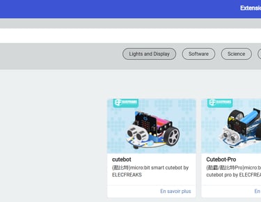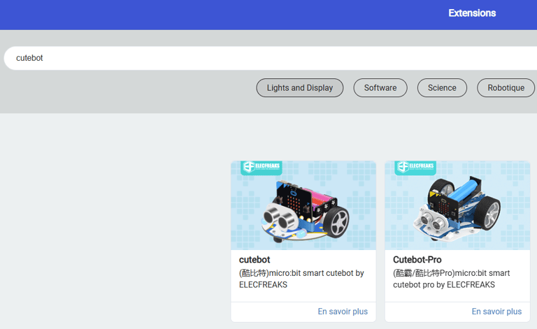 Afin de programmer le CuteBot, il faut d'abord installer son extension MakeCode. Pour ce faire, allez dans Extensions puis lancez la recherche "cutebot". Après sélection et validation, les blocs de programmation CuteBot apparaîtront dans votre menu Blocs.